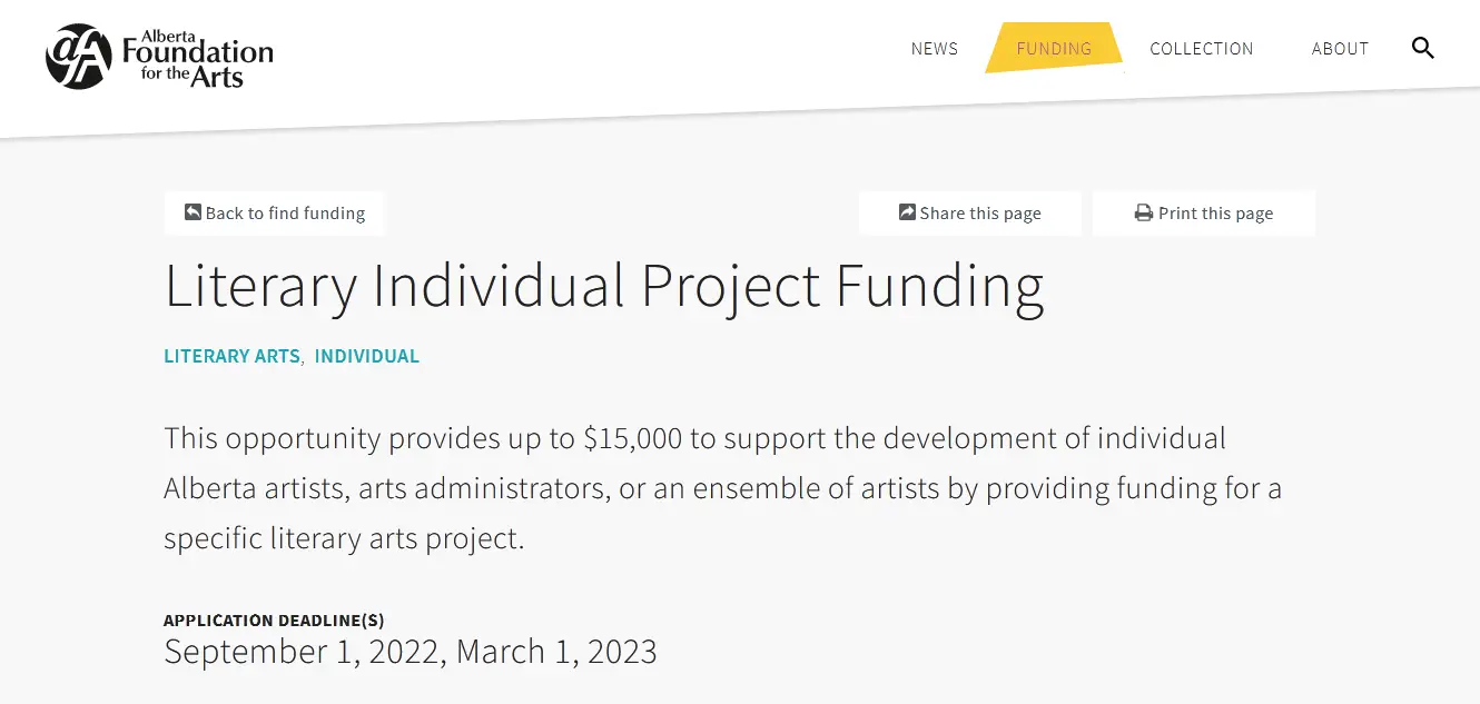 By offering to finance a specific literary art project, this opportunity offers up to $15,000 to assist the growth of individual Alberta artists, arts administrators, or an ensemble of artists.