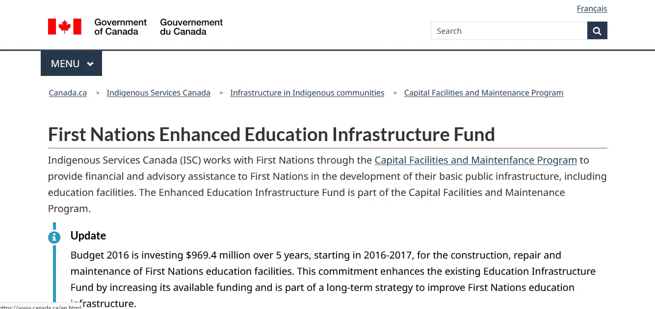 The Capital Facilities and Maintenance Program includes the Enhanced Education Infrastructure Fund. This programme assists First Nations in the construction of new schools, the renovation and expansion of existing facilities, as well as the operation and maintenance of existing educational infrastructure.