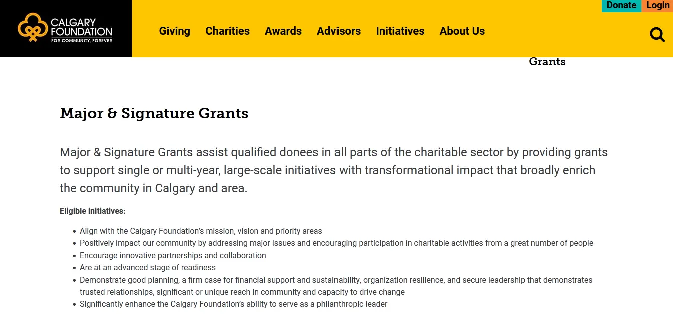 Signature & Major Grants help charity organizations in all industry sections by giving funding for single or multi-year, large-scale charitable activities that have a broad scope and improve our communities. Grants assist local or national programmes that have an impact on Calgary and the surrounding area by tackling key challenges and inspiring a large number of persons to participate in philanthropic activities.