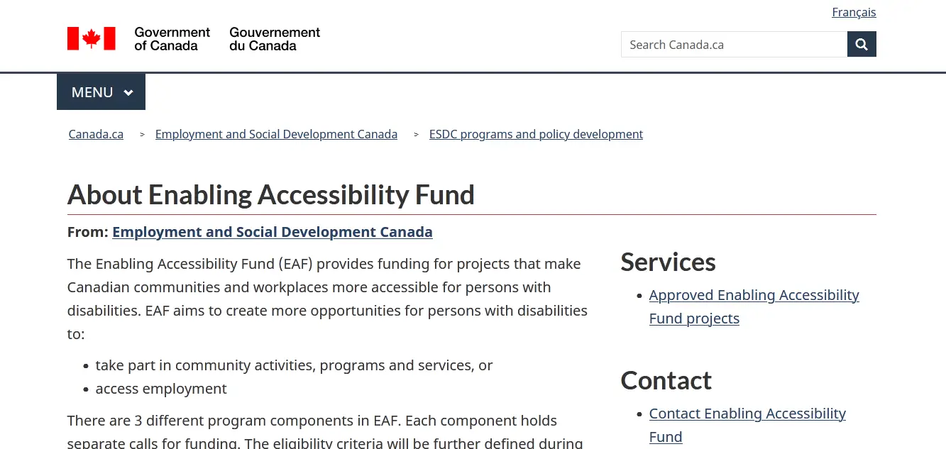 The Enabling Accessibility Fund (EAF) provides funding for eligible capital projects that improve accessibility for people with disabilities in Canadian communities and workplaces, thereby increasing opportunities for people with disabilities to participate in community activities, programs, and services to find work.